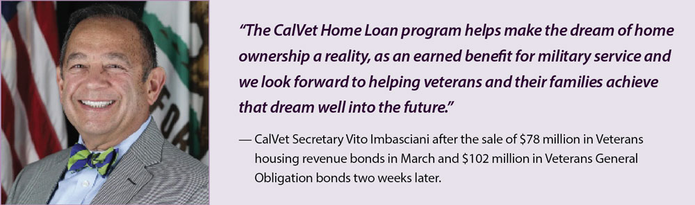 - Sold $101.71 million of Veterans general obligation bonds and $78.15 million of Veterans revenue bonds to help veterans achieve home ownership through below market interest rate loan products and assistance with down payment and closing costs.