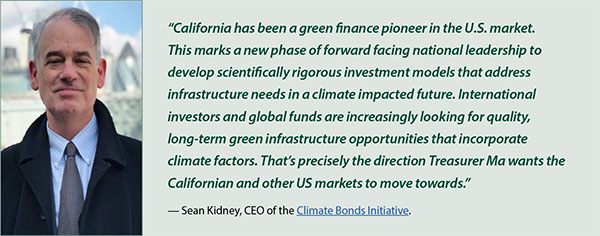 Treasurer Ma serves as a member on the Climate Bonds Standard Board, which utilizes rigorous scientific criteria to label investments as “Climate Bond Certified” in certain countries. This body relies on the work of academics, engineers, public policy experts, attorneys, and climate scientists to objectively determine what is green and what is not. In this time when socially conscious investors are demanding more “green” investments, the STO sees the opportunity to demonstrate its leadership.