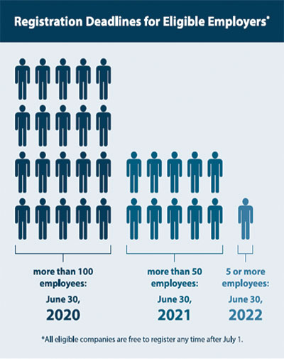 The state law enacting CalSavers requires employers to either sponsor a private market retirement plan or participate in CalSavers. Eligible employers with more than 100 employees will be required to comply by June 30, 2020. Eventually, all employers without employee retirement savings plans and who have five or more employees will be required to participate. Registration deadlines will vary based on the size of the business.